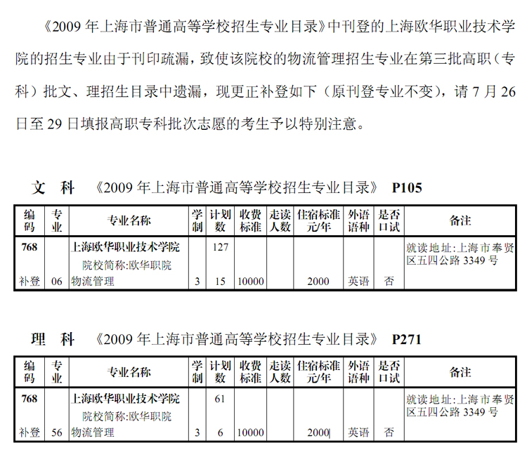 关于增补上海欧华职业技术学院招生专业的通知